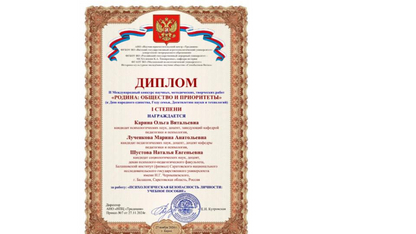 Преподаватели БИ СГУ, доценты кафедры педагогики и психологии М.А. Лученкова, О.В. Карина, Н.Е. Шустова стали дипломантами Международного конкурса научных, методических, творческих работ «РОДИНА: ОБЩЕСТВО И ПРИОРИТЕТЫ» (ко Дню народного единства, Году семьи, Десятилетию науки и технологий).