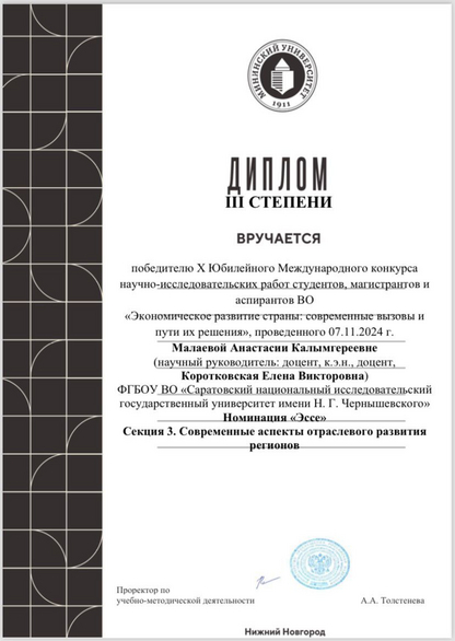 Студентка 2 курса экономического факультета, Анастасия Малаева заняла 3 место на X Юбилейном Международном конкурсе научно-исследовательских работ студентов, магистрантов и аспирантов с темой "Роль туризма в развитии регионов России"! 👏