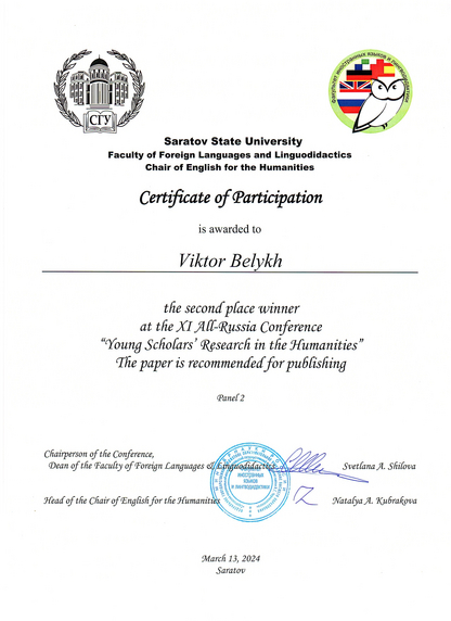 Аспирант очной формы обучения Белых Виктор (кафедра социальной психологии образования и развития, научный руководитель профессор Шамионов Р.М.) стал одним из победителей конкурса научных докладов на XI Всероссийской научно-практической конференции «Young Scholars’ Research in the Humanities» на английском языке