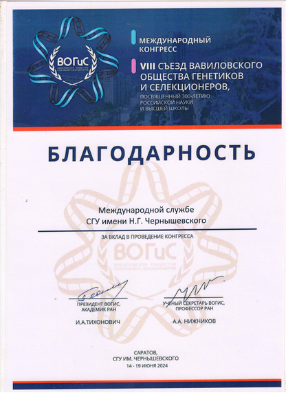 В адрес Международной службы поступила благодарность от Вавиловского общества генетиков и селекционеров за вклад в организацию проведения конгресса, подписанная Президентом ВОГИС, академиком РАН И.А. Тихоновичем.