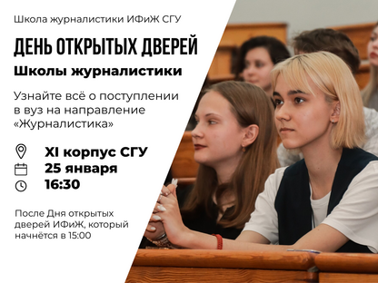 Школа журналистики расскажет о годовом курсе на Дне открытых дверей 29 сентября. Начало в 11:00 в 208 аудитории 11 корпуса СГУ. Онлайн-трансляция будет вестись в официальной группе ВКонтакте.