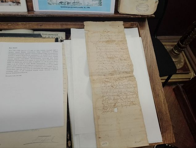 На обзоре были представлены не только краеведческие издания по истории города, но также документы и рукописи XVII-XIX вв. Материалы из собрания Б. В. Зайковского посвящены истории левобережного Саратова. Столбцы 1685 и 1688 гг. представляют собой владельческие выписи на сенные покосы. Одна из них была выдана воеводой саратовским конным стрельцам, другая – священнику Крестовоздвиженского женского монастыря. Рукописная арифметика 1763 г. происходит из семьи Баратаевых.