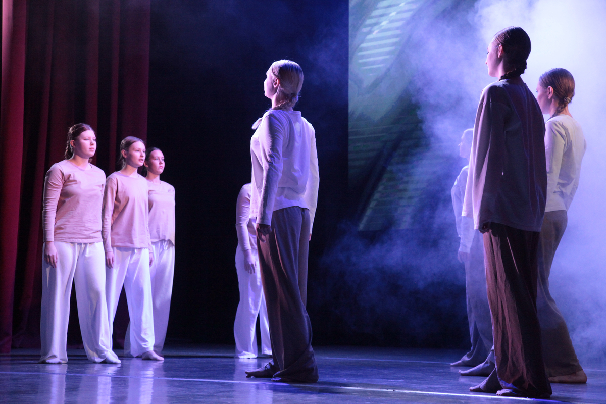 Танцевальный коллектив «Пассажиры» представил творческий номер: тревожная музыка, перерастающая в грохочущие аккорды, передала страх людей в военное время и их непоколебимое стремление защитить Родину.