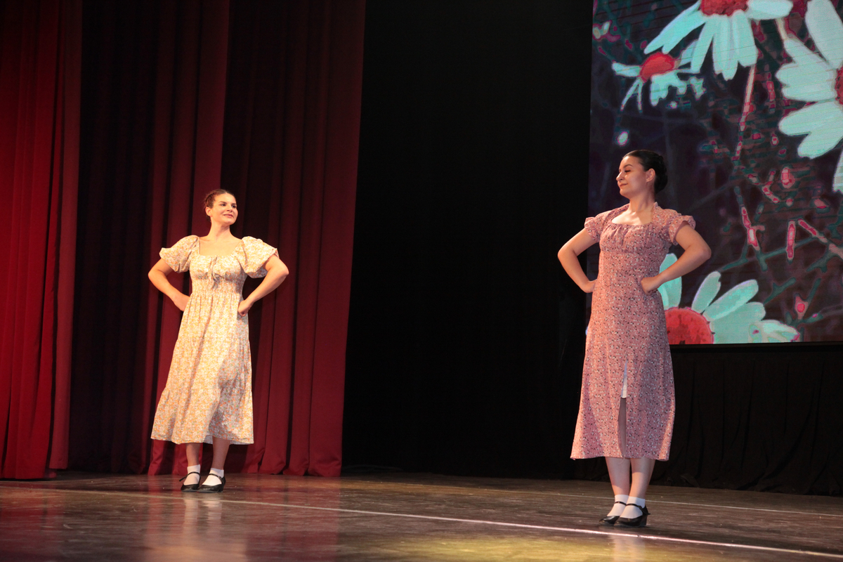 Весёлые улыбки и лёгкие шаги коллектива народного танца «Меридиан» напомнили зрителям о немногочисленных светлых моментах в ожидании возвращения мира. Задорная музыкальная композиция задала настроение выступлению дуэта девушек в платьях с цветочным узором, стилизованных под сороковые годы.