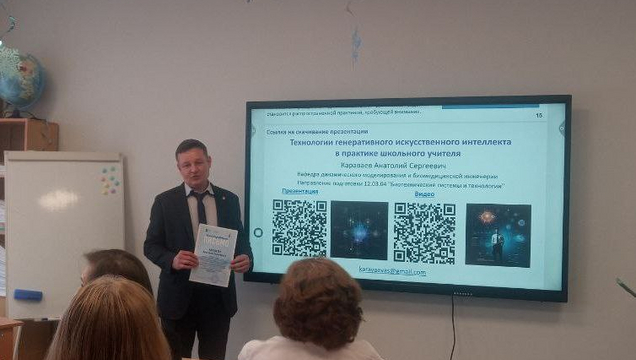 Заведующий кафедрой динамического моделирования и биомедицинской инженерии СГУ, профессор А.С. Караваев провёл для педагогов интерактивную сессию «Технологии генеративного искусственного интеллекта в практике школьного учителя». Участники на практике разобрали, как современные ИИ-инструменты могут стать помощниками в подготовке материалов, индивидуализации обучения и развитии проектного мышления обучающихся.