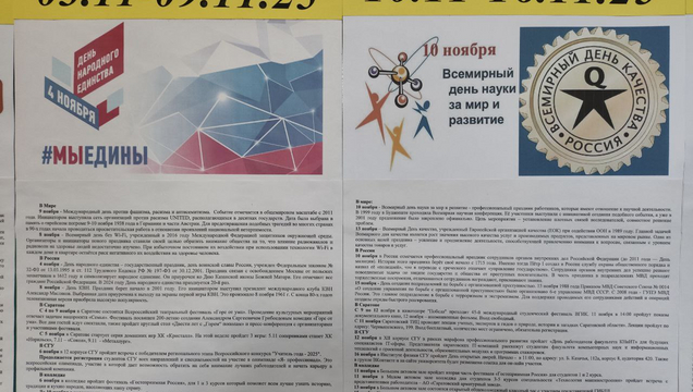 Из еженедельных выпусков все узнали, когда отмечается Международный день против фашизма, Всемирный День информации и Международный день студентов. Отметили праздники России: День народного единства, день рождения КВН, профессиональные праздники. Из саратовских новостей самым интересно было узнать про студенческий фестиваль ВГИКи театральный фестиваль «Горе от ума», а также открытие Ботанического сада СГУ.