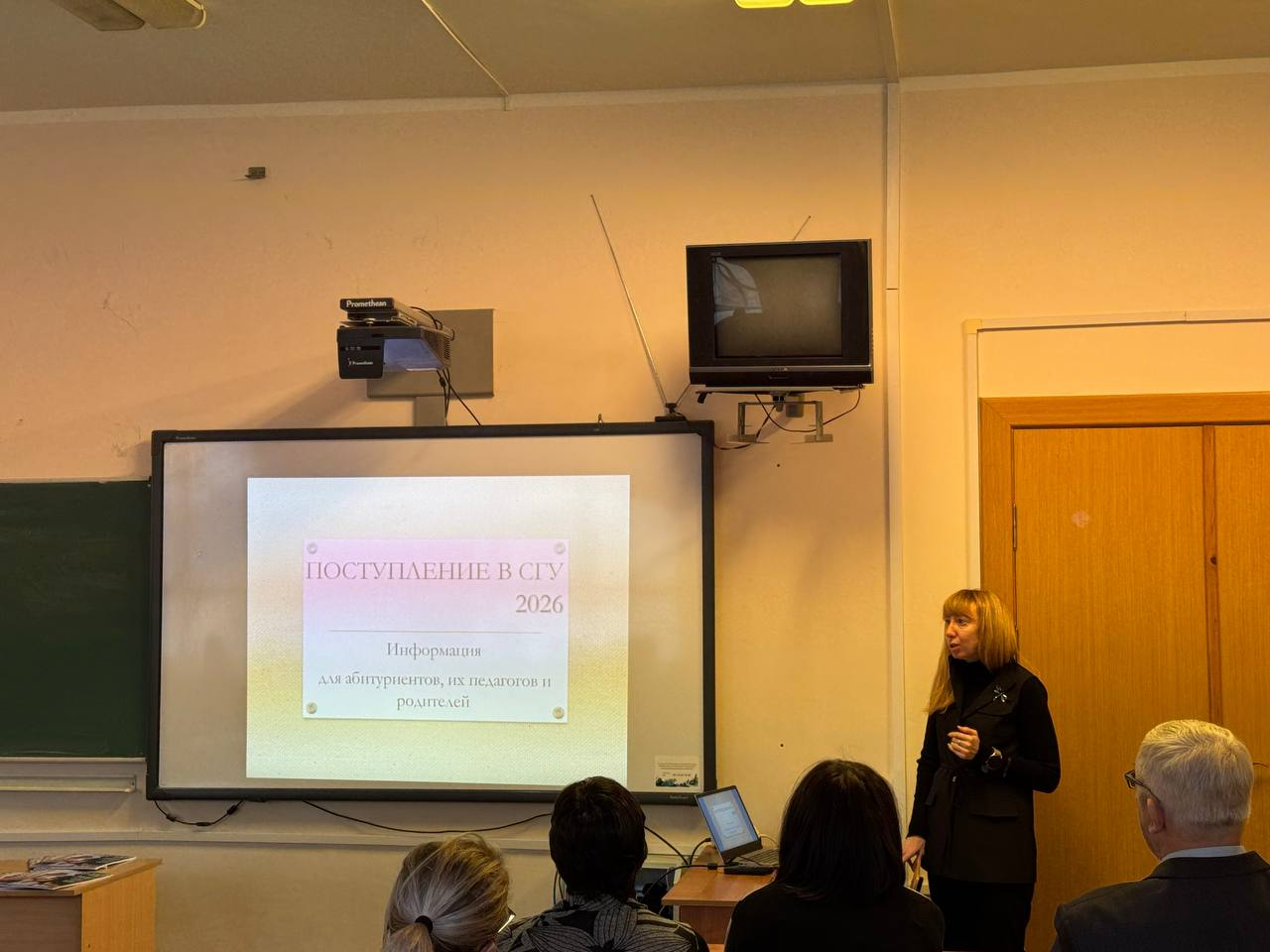 Хмелькова О.В., ответственный секретарь приемной комиссии факультета рассказала абитуриентам и их родителям о правилах приёма в университет, ознакомила с перечнем вступительных испытаний, необходимых для поступления. Она озвучила информацию об условиях поступления, о сроках и правилах приёма документов, а также познакомила с порядком учета индивидуальных достижений при поступлении в Педагогический институт СГУ.