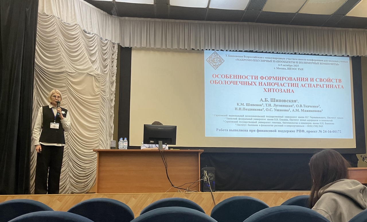 Профессор, заведующий кафедрой полимеров на базе ООО «АКРИПОЛ» Шиповская Анна Борисовна выступила с устным докладом «Особенности формирования и свойств оболочечных наночастиц аспарагината хитозана» на X Бакеевской Всероссийской с международным участием школе-конференции для молодых ученых «Макромолекулярные нанообъекты и полимерные композиты». Мероприятие проходило 6-9 октября 2025 г. в Институте элементоорганических соединений им. А.Н. Несмеянова РАН в Москве.