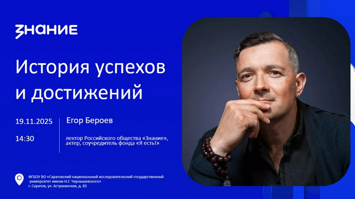 19 ноября лектор Российского общества «Знание», актёр, соучредитель фонда «Я есть!» Егор Бероев встретится с участниками Молодёжного съезда студентов. Мотивационная лекция пройдёт на площадке Саратовского университета.