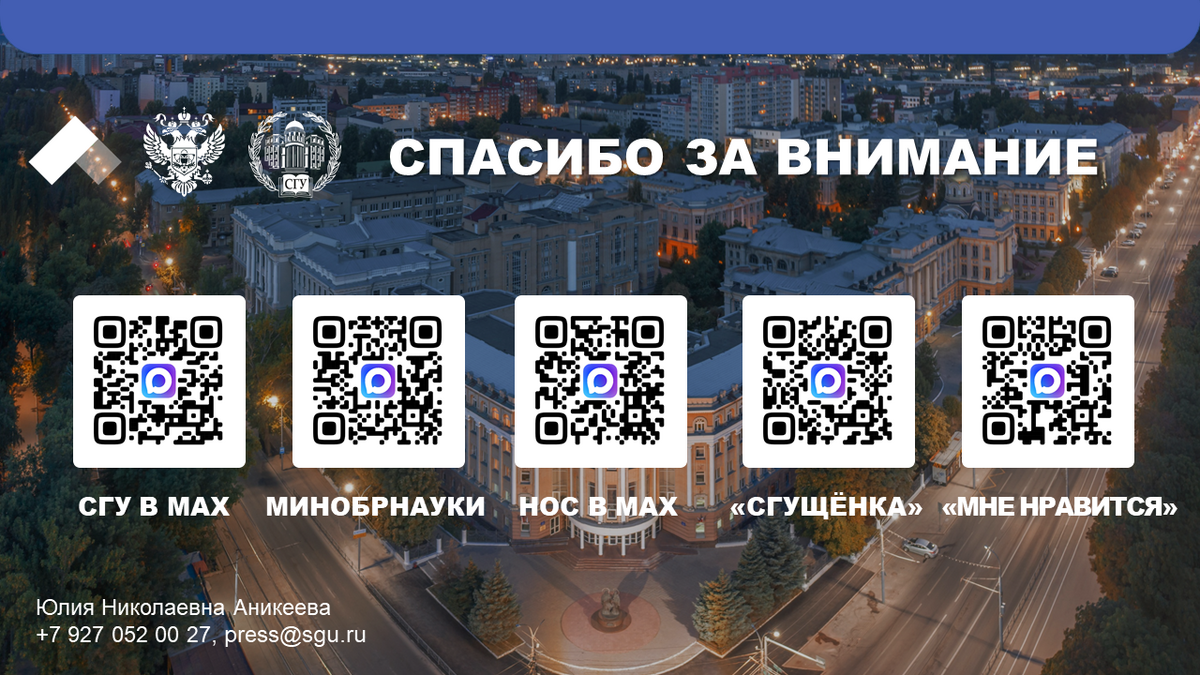 Ю.Н. Аникеева поблагодарила за предоставленную возможность выступить на итоговом совещании Департамент информационной политики и комплексной безопасности Минобрнауки России, команду ВК за помощь и консультацию при работе с новым мессенджером, а также ректора СГУ А.Н. Чумаченко и куратора информационной политики университета, советника при ректорате Е.Г. Елину за помощь и поддержку.