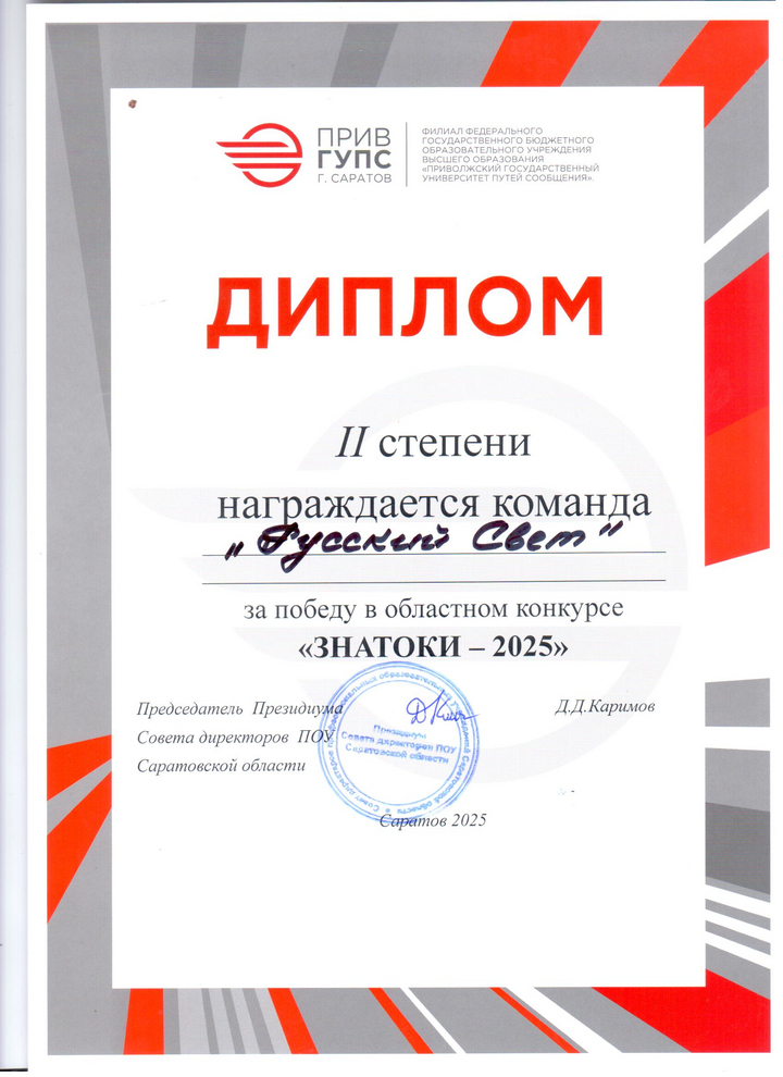 26 ноября 2025 года в актовом зале Саратовского филиала ПривГУПС прошел ежегодный конкурс «Знатоки 2025» для студентов СПО Саратовской области. В этом году в нем приняли участие 8 команд.