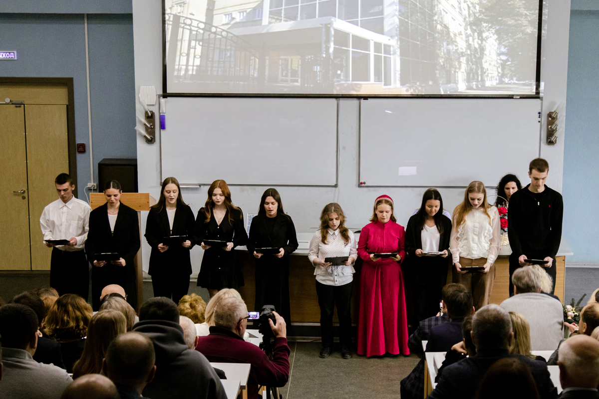 У студентов 1950-х был свой корпоративный гимн, который они бережно передали другим поколениям. Сегодняшние студенты-мехматовцы восстановили его и спели вместе с гостями торжества.