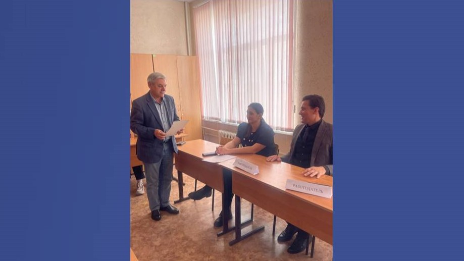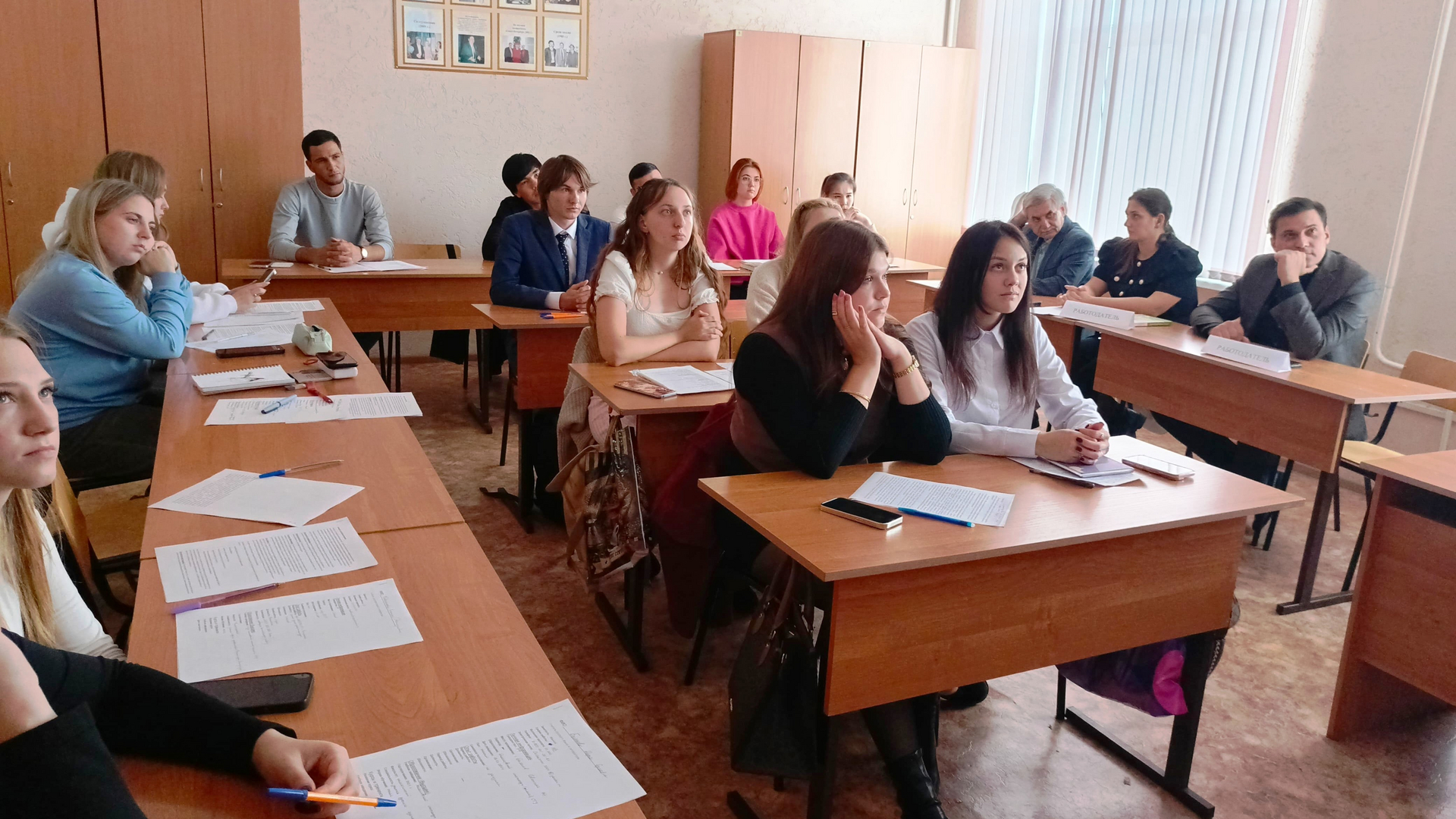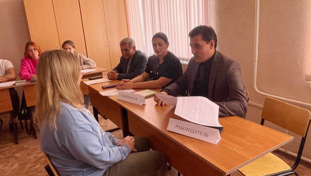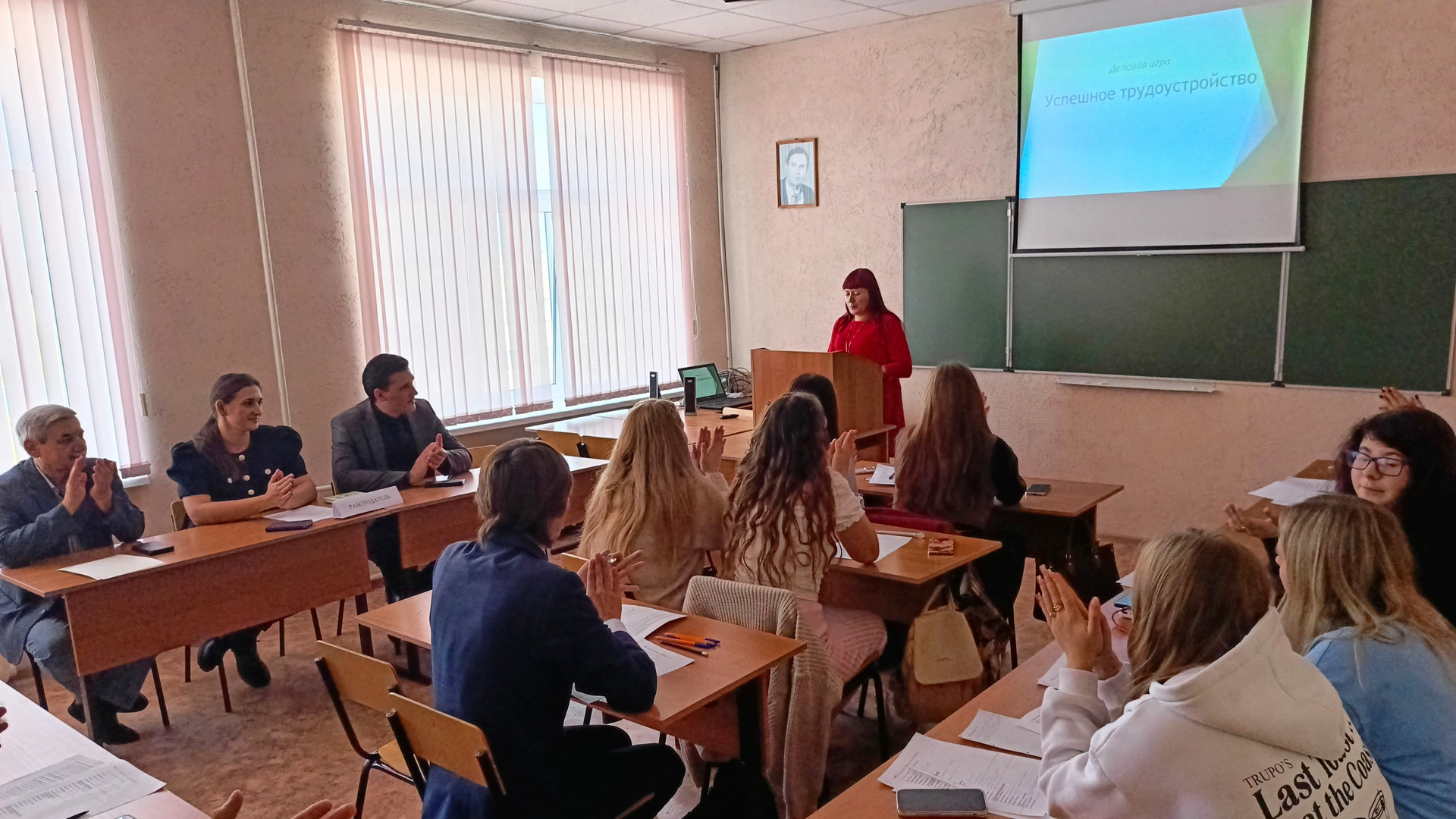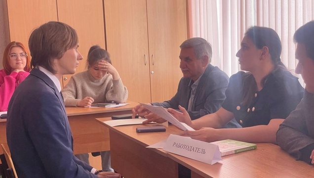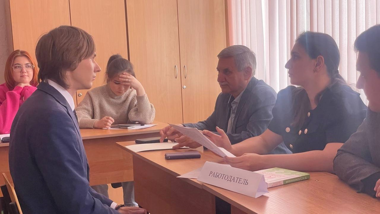 После этого студентам 4 курса профилей «Русский язык. Литература» было предложено в качестве соискателей пройти процедуру собеседования с потенциальными работодателями, в роли которых в ходе деловой игры выступили директор МАОУ СОШ № 9 имени П.А. Столыпина г. Балашова А.Г. Рыжков и заместитель директора по воспитательной работе МАОУ СОШ № 3 г. Балашова Ю.А. Поберий.