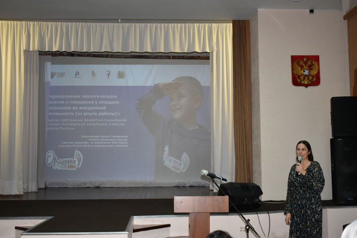 У.Г. Каретникова и ученики начальных классов МОУ «Лицей» г. Балашова подготовили выступление на тему: «Формирование экологического сознания и поведения у младших школьников во внеурочной деятельности», которое завершили выступлением самого «экологичного» музыкального ансамбля «Озорные ложки».
