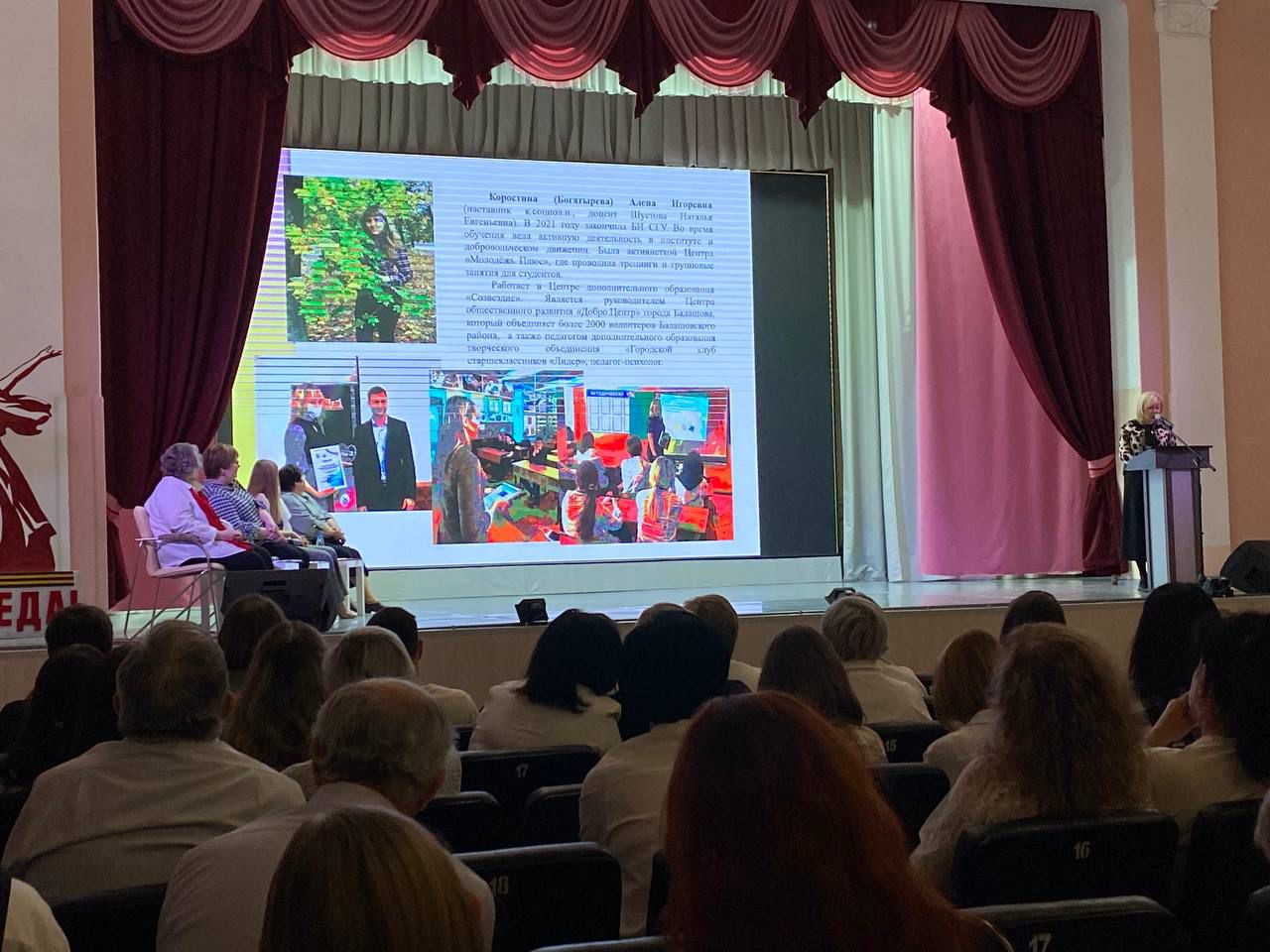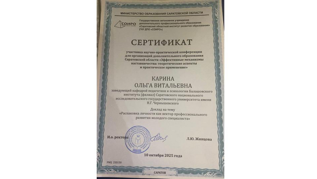 10 октября заведующая кафедрой педагогики и психологии О. В. Карина представляла Балашовский институт СГУ имени Н.Г. Чернышевского на научно-практической конференции для организаций дополнительного образования Саратовской области «Эффективные механизмы наставничества: теоретические аспекты и практическое применение».