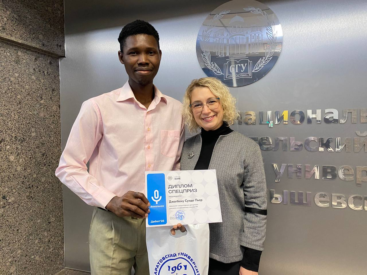 Иностранный студент первого курса факультета гуманитарных дисциплин, русского и иностранных языков Педагогического института, приехавший в Саратов из Бенина, получил Специальный приз в номинации «Вокальное направление».