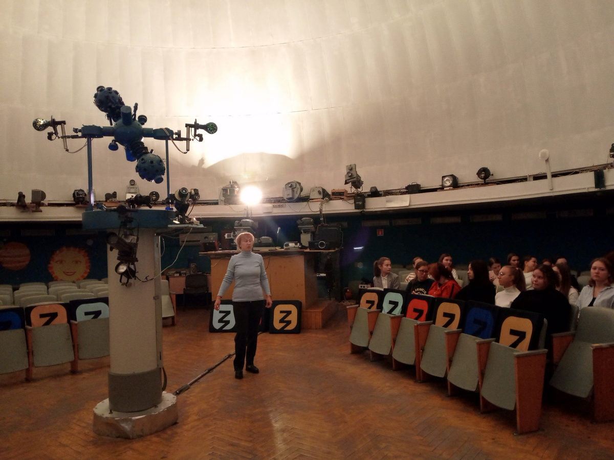Светлана Владимировна Кукунина, заведующий отделом Саратовского планетария имени Ю.А. Склярова, рассказала об уникальном аппарате (фирмы «Карл Цейс Йена»), с помощью которого демонстрируют звёздное небо как Северного, так и Южного полушарий Земли (включающее 5800 звёзд), его проекция производится на купол высотой 10 метров. Затем студенты совершили увлекательное путешествие по ночному звёздному небу, в ходе которого услышали удивительные факты и легенды о звёздах, созвездиях, галактиках и планетах Солнечной системы.