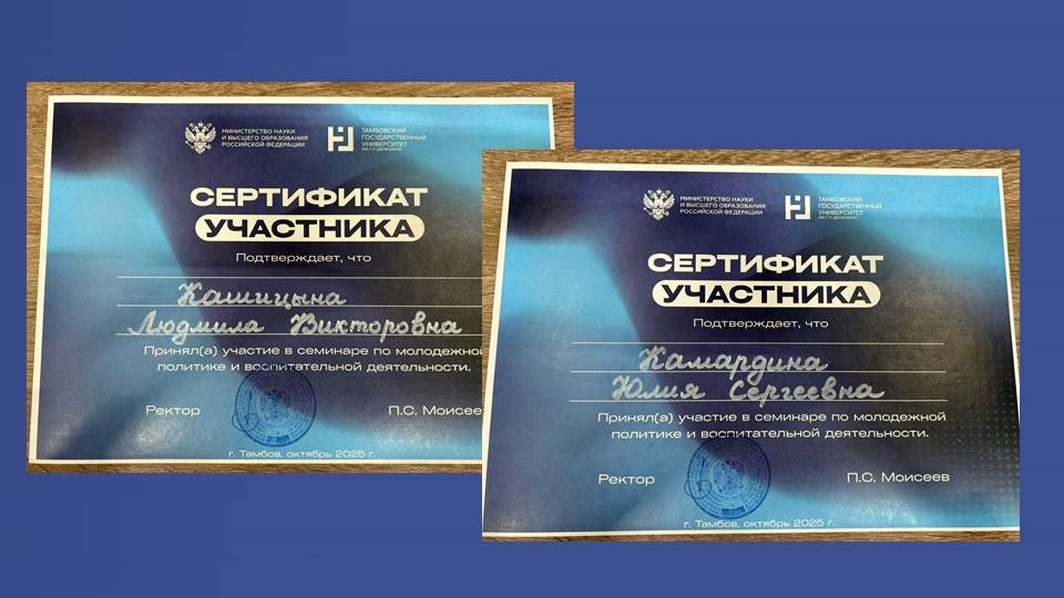 Доцент кафедры филологических дисциплин Ю.С. Камардина и доцент кафедры физической культуры и безопасности жизнедеятельности Л.В. Кашицына приняли участие в межрегиональном семинаре по молодежной политике и воспитательной деятельности на базе Тамбовского государственного университета имени Г.Р. Державина.