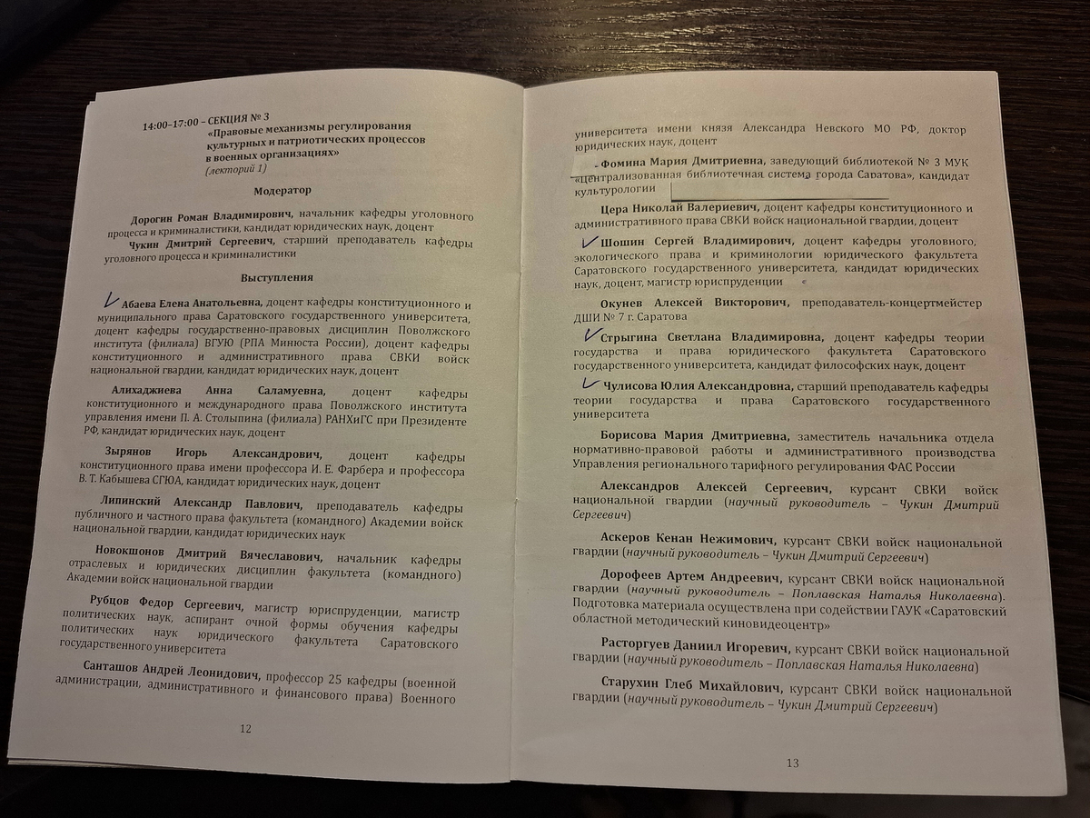 Преподаватели юридического факультета:доцент Е.О. Абаева, доцент С.В. Стрыгина, доцент С.В. Шошин, ст. преподаватель Ю.А. Чулисова, а также студентка 232 группы направления подготовки «юриспруденция» А. В. Яраловаприняли участие в I Международной научно - практической конференции: «Патриотизм как интегративный феномен: военно- социальные аспекты, образовательные стратегии и правовые основы». Организатором конференции был Саратовский военный ордена Жукова Краснознамённый институт войск национальной гвардии. Конференция проходила два дня 18 и 19сентября 2025 года.
