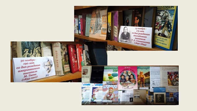 Книжная выставка посвящена творчеству двух знаменитых писателей мировой литературы – Роберту Льюису Бэлфору Стивенсону (1850–1894) и Марку Твену (1835–1910).