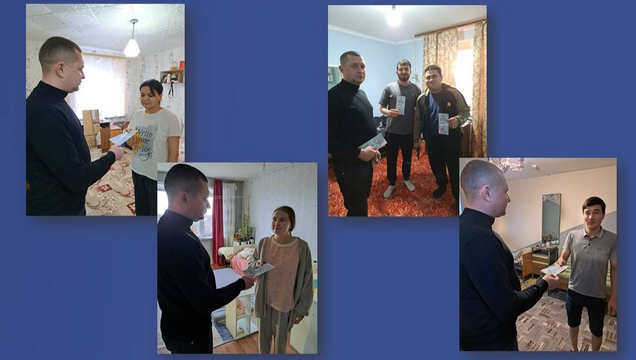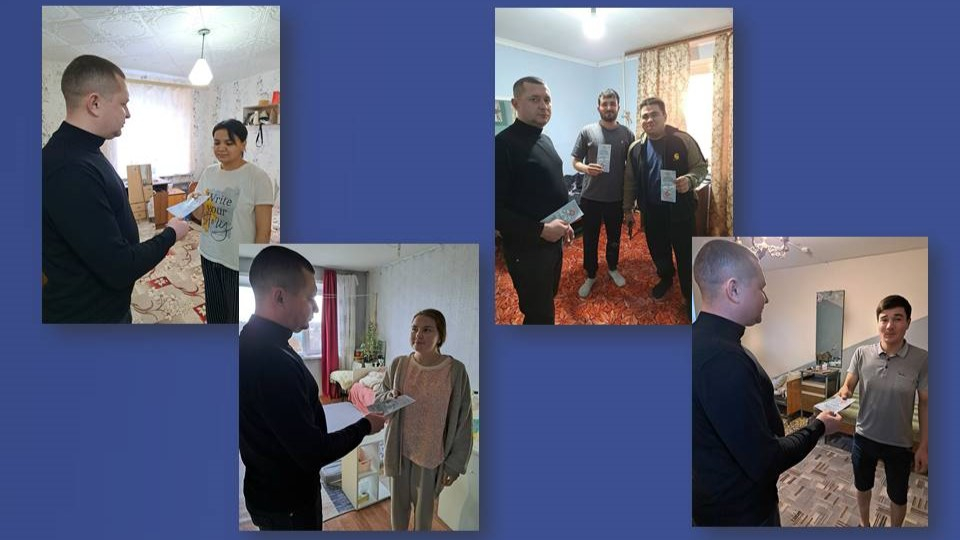 После общего собрания состоялся обход жилых комнат, в ходе которого О.С. Грицинин лично пообщался со студентами и вручил им информационные буклеты, разъясняющие вопросы уголовной ответственности за преступления, связанные с незаконным оборотом наркотиков.