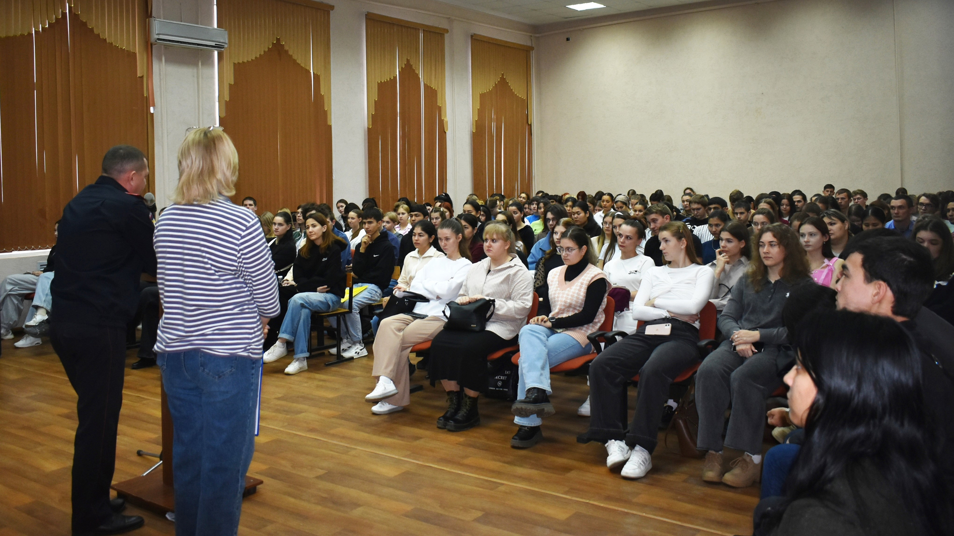 Основное мероприятие прошло в актовом зале института, где собрались студенты разных курсов. Встречу открыла начальник отдела по воспитательной и социальной работе Т.А. Котова: «Сегодня мы собрались для разговора на одну из самых сложных и тревожных тем современности – тему распространения и употребления психоактивных веществ. Это не абстрактная проблема где-то там, в большом мире, это реальная угроза, которая может коснуться любого, независимо от уровня образования, социального статуса или круга общения. Молодежь, к сожалению, находится в особой группе риска – в период активного поиска себя, нового окружения и порой под влиянием ложных иллюзий о «легких» решениях проблем, совершаются роковые ошибки. Именно поэтому наша с вами общая задача – сделать все возможное, чтобы этих ошибок не допустить. Профилактика – это не просто слово из лексикона педагогов и правоохранителей. Это практика ответственного отношения к собственной жизни. Это понимание, что ваше здоровье – это не возобновляемый ресурс, а ваша безопасность – фундамент, на котором строится все: карьера, семья, личное счастье».
