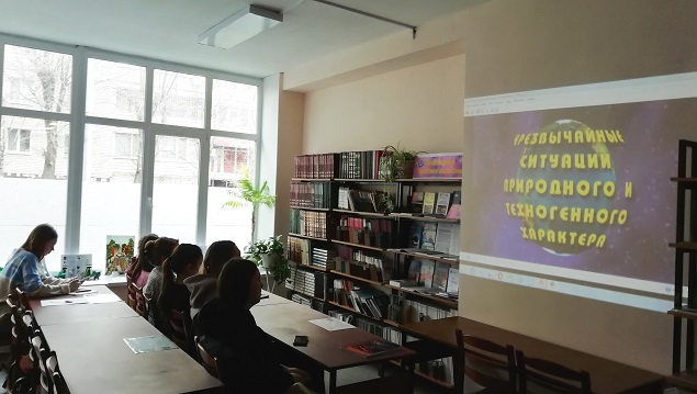В начале мероприятия студенты прослушали обзор книг и периодических изданий, в которых раскрываются общие понятия безопасности жизнедеятельности, содержатся подробные сведения о причинах возникновения, последствиях и профилактике чрезвычайных ситуаций различного происхождения, а также приведены сведения о действующих системах защиты населения и территорий в условиях чрезвычайных ситуаций. Обзор был проведён сотрудником читального зала Е. И. Балякиной.