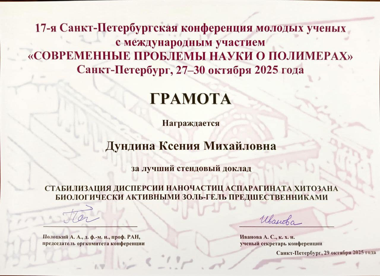Работа «Стабилизация дисперсии наночастиц аспарагината хитозана биологически активными золь-гель предшественниками» аспирантки Института химии Дундиной Ксении Михайловны (научный руководитель Шиповская А.Б.) оценена грамотой за лучший стендовый доклад в секции «Биополимеры и полимеры медицинского назначения».