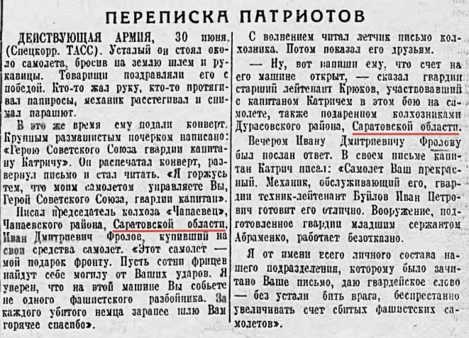 1 июля 1943 г. («Красная звезда», № 153 (5524)) в статье «Переписка патриотов» специальный корреспондент ТАСС приводит переписку председателя колхоза «Чапаевец» Чапаевского района Саратовской области Ивана Дмитриевича Фролова с Героем Советского Союза лётчиком Катричем. В ответном письме гвардии капитан Катрич заверяет, что будет без устали бить врага на подаренном ему чапаевцами самолёте. [22]