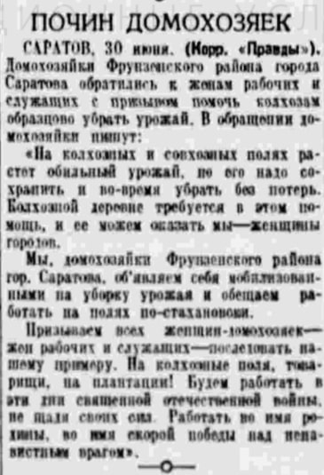 В газете «Правда» от 1 июля 1941 года в материале «Почин домохозяек» опубликован призыв женщин-домохозяек Фрунзенского района города Саратова к жёнам рабочих и служащих о помощи в уборке урожая: «<...> Работать во имя Родины, во имя скорой победы над ненавистным врагом», – призывают домохозяйки. [26]