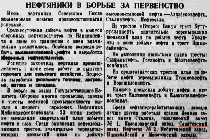 3 июля 1942 г. («Правда», № 184 (8955)) в заметке «Нефтяники в борьбе за первенство» рассказывается о борьбе промыслов, заводов и трестов нефтяной промышленности страны за знамя Государственного Комитета Обороны. Среди прочих, включился в соревнование и вышел в передовики и наш Саратовский завод. [27]