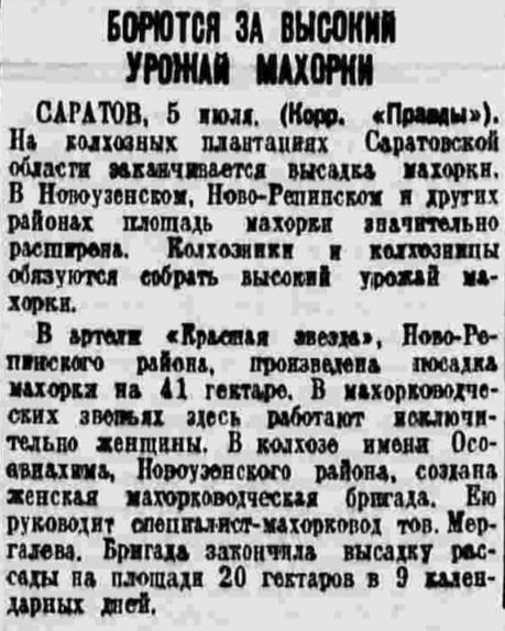 Корреспондент газеты «Правда» от 6 июля 1942 г. в статье «Борются за высокий урожай махорки» рассказывает о том, что в Саратовской области уже завершается высадка махорки и женщины-махорководы в будущем надеются на богатый урожай. [29]