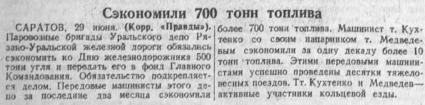 В заметке «Сэкономили 700 тонн топлива» от 30 июня 1943 г. «Правда» сообщает, что бригады Рязано-Уральской железной дороги передали сэкономленное топливо в фонд Главного Командования. Обязательство подкрепляется делом! [30]