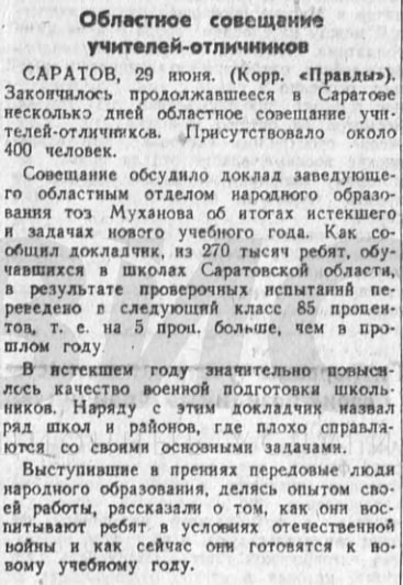 В этом же номере газеты на третьей странице корреспондент «Правды» освещает состоявшееся в г. Саратове областное совещание учителей-отличников, на котором присутствовало около 400 человек. На совещании были подведены итоги текущего и обсуждены планы на будущий учебный год, не обошлось и без порицаний в адрес некоторых нерадивых директоров школ Саратовской области. Участники совещания активно делились опытом своей работы в условиях Великой Отечественной войны. [31]
