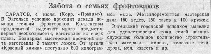 5 июля 1943 г. в «Правде» корреспондент рассказывает о многогранном проявлении заботы – в г.Энгельс Саратовской области успешно проходит декада помощи семьям фронтовиков: участие принимает и бондарная мастерская, и артель «Красный химик», и металлоремонтная мастерская. В подарки готовы ложки, вёдра, тазы, кружки, мыло. Семьям фронтовиков выделен также разнообразный строительный материал на средства от Энгельсского городского исполкома. [38]