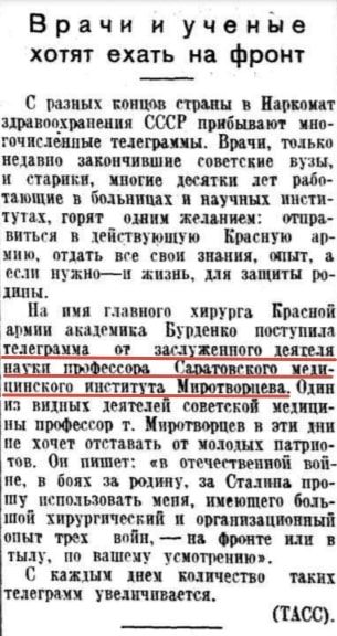3 июля 1941 года («Известия», № 155 (7531)) в заметке «Врачи и учёные хотят ехать на фронт» корреспондент ТАСС сообщает о телеграмме профессора Саратовского медицинского института Миротворцева главному хирургу Красной армии академику Бурденко с просьбой отправить его на фронт или использовать его большой хирургический опыт в тылу. Корреспондент отмечает, что количество подобных обращений по стране с каждым днём увеличивается. [2]