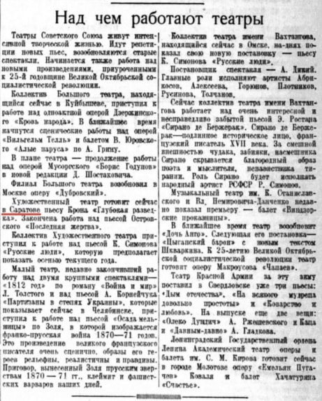 В заметке «Над чем работают театры» («Известия» 1 июля 1942 г.) сообщается о том, что театры Советского Союза и в тяжёлые военные годы продолжают жить интенсивной творческой жизнью и стараются радовать зрителей. Идут репетиции новых пьес, возобновляется показ уже готовых постановок. Так, наряду с другими ведущими коллективами страны, упоминается МХАТ, который, находясь в Саратове, готовит пьесу Крона «Глубокая разведка». Здесь же закончена работа над пьесой Островского «Последняя жертва». Одновременно с этим коллектив Художественного театра приступил к работе над пьесой К. Симонова «Русские люди». А как известно, город отрочества и юности Константина Симонова – Саратов. [3]
