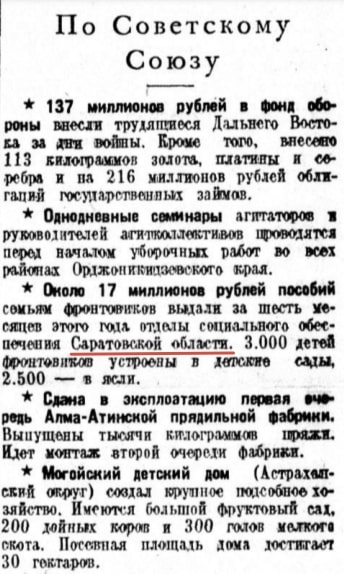 2 июля 1942 года («Известия», № 153 (7839)) в постоянной рубрике «По Советскому Союзу» корреспондент рапортует: «<...> Около 17 миллионов рублей пособий семьям фронтовиков выдали за шесть месяцев этого года отделы социального обеспечения Саратовской области. 3000 детей фронтовиков устроены в детские сады. 2500 – в ясли». Это несомненно является весомой поддержкой государства фронтовикам и их семьям. [5]