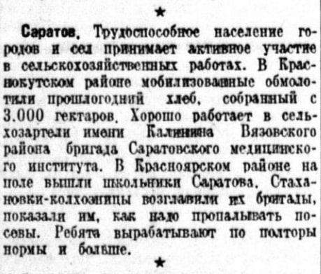 В материале «На полях страны» («Известия» 3 июля 1942) описана помощь населения в сельхозработах: мобилизованные помогают в обмолоте прошлогоднего хлеба; бригада Саратовского мединститута пропалывает посевы, перевыполняя нормы; школьники Саратова, наравне со взрослыми, вырабатывают по полторы нормы и даже больше. [6]