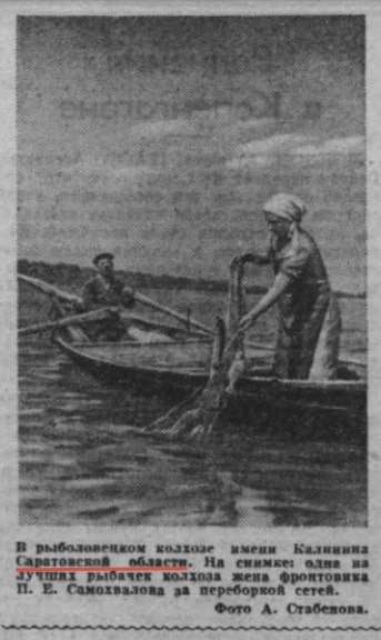 На третьей странице газеты «Известия» от 1 июля 1944 г. размещена фотография А. Стабенова – «В рыболовецком колхозе имени Калинина Саратовской области». На снимке запечатлён момент: одна из лучших рыбачек колхоза, жена фронтовика П.Е. Самохвалова перебирает сети. Страна гордится такими самоотверженными женщинами, подругами, сёстрами, жёнами, которые своим ратным трудом приближают нашу общую Победу. [16]