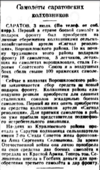 В статье «Самолёты саратовских колхозников» («Известия», 4 июля 1944) собственный корреспондент газеты рассказывает: «<...> Первый в стране боевой самолёт в подарок фронту был приобретён на личные сбережения колхозниками сельскохозяйственной артели «Сигнал революции» Ворошиловского района. По их почину трудящиеся колхозов этого района подарили фронту 18 самолётов, 5 лётчиков, летающих на самолётах ворошиловцев, стали героями Советского Союза и в воздушных боях сбили свыше 100 вражеских самолётов». Корреспондент отмечает, что в колхозах Ворошиловского района заканчивается сбор средств на новый подарок фронту. [17]