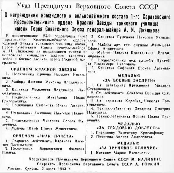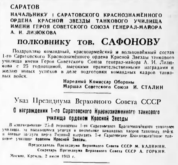 О награждении Саратовского танкового училища и его командного состава 3 июля 1943 года сообщается также в газетах: «Красная Звезда» (№ 155 (5526)) [23], [24], [25] и «Правда» (№ 166 (9302)). [33], [34], [35]