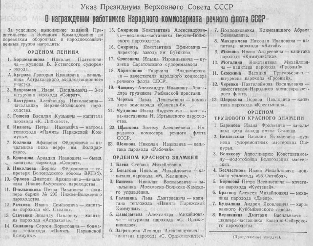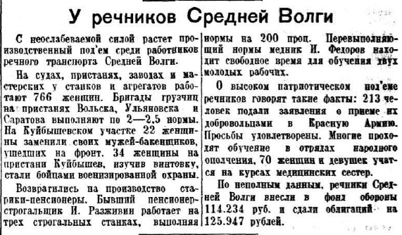 В газете «Известия» от 11 сентября 1941 года на четвертой странице помещена публикация – «У речников Средней Волги» - где сообщается о том, что «на судах, пристанях, заводах и мастерских у станков и агрегатов работают 766 женщин. Бригады грузчиц на пристанях Вольска, Ульяновска и Саратова выполняют по 2-2,5 нормы». В публикации, отмечается, что «По неполным данным речники Средней Волги внесли в фонд обороны 114.234 рубля и сдали облигаций на 125.947 рублей». [2]