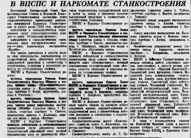 Статья «В ВЦСПС и Наркомате Станкостроения» была опубликована в газете «Правда» от 10 сентября 1942 года на третьей странице. В ней говорится о том, что «Саратовский завод зуборезных станков получил премию и был отмечен за хорошую работу ВЦСПС и Наркоматом Станкостроения». [7]