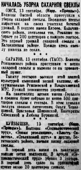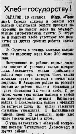 Передовица «Хлеб – государству. Саратов» опубликована в газете «Правда» от 11 сентября 1944 года. В ней рассказывается, о том, что «колхозы и совхозы всех районов Саратовской области проводят воскресник по вывозу зерна на государственные заготовительные пункты. В работе воскресника принимают участие все незанятые в срочных делах колхозники, которые участвуют в погрузке и выгрузке хлеба». [22]