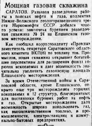 Публикация «Мощная газовая скважина. Саратов» была напечатана в газете «Правда» от 8 сентября 1944 года на первой странице. В ней рассказывается, о том, что «развивая разведочные работы в поисках нефти и газа, коллектив Нижне-Волжского геологического треста Наркомнефти СССР добился успеха, была закончена «бурением разведочная скважина № 24 на Елшанском газовом месторождении. «Новая скважина открывает богатейшие перспективы для расширения фонда горючих ископаемых, и даёт возможность значительно увеличить газоносную площадь Елшанского месторождения», - поделился с корреспондентом «Правды», заместитель секретаря Саратовского областного комитета ВКП (б) по топливу тов. Промыслов». [20]