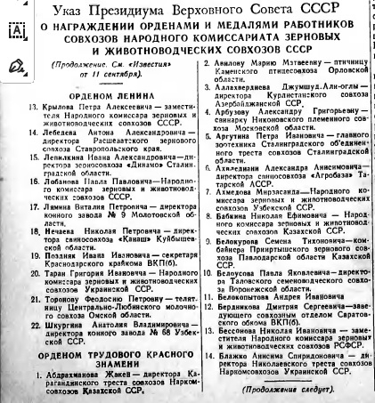 В газете «Известия» от 12 сентября 1945 года на второй странице размещен Указ Президиума Верховного Совета СССР О награждении орденами и медалями работников совхозов народного комиссариата зерновых и животноводческих совхозов СССР. В нем отмечается, что за успешное выполнение заданий Правительства по производству и сдаче сельскохозяйственных продуктов и сырья в трудных условиях военного времени наградить: Орденом трудового Красного Знамени «Бердникова Дмитрия Сергеевича – заведующего совхозным отделом Саратовского обкома ВКП (б)». [33]