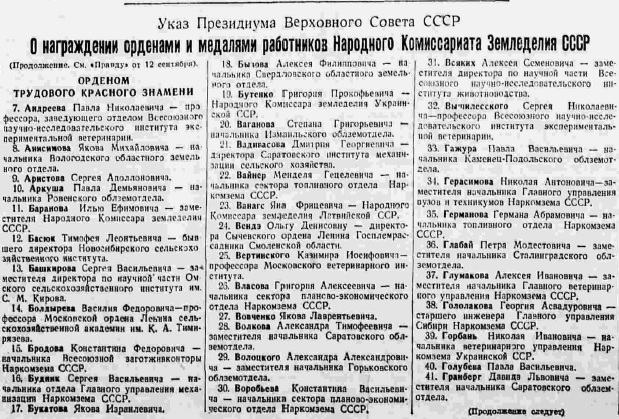 В газете «Правда» от 13 сентября 1945 года на первой странице размещен Указ Президиума Верховного Совета СССР О награждении орденами и медалями работников Народного Комиссариата Земледелия СССР. В нем отмечается, что за успешное выполнение заданий Правительства в трудных условиях войны по обеспечению фронта и населения страны продовольствием, а промышленности сельскохозяйственным сырьём наградить: Орденом Трудового Красного Знамени «директора Саратовского института механизации сельского хозяйства Вадивасова Дмитрия Георгиевича, заместителя Саратовского облземотдела Волкова Александра Тимофеевича, заместителя Саратовского облземотдела Гринберг Давида Львовича». [36]