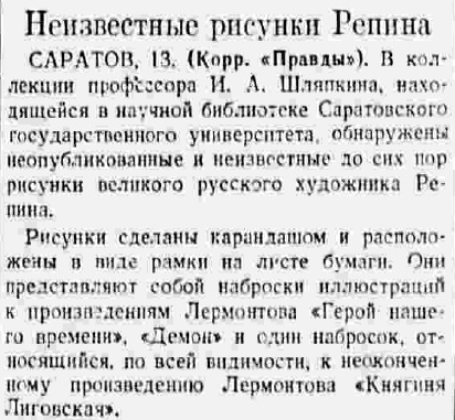Сообщение корреспондента «Правды» из города Саратова размещено в газете «Правда» за 14 сентября 1945 год на третьей странице. В сообщении «Неизвестные рисунки Репина», корреспондент информирует что «в коллекции профессора И. А. Шляпкина, которая находится в научной библиотеке Саратовского государственного университета, обнаружены неопубликованные и неизвестные до сих пор рисунки великого русского художника и живописца И. Е. Репина». Они представляют собой наброски иллюстраций к произведениям М. Ю. Лермонтова «Герой нашего времени», «Демон» и один набросок к незаконченному произведению М. Ю. Лермонтова «Княгиня Лиговская». [38]