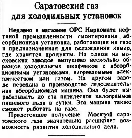 Применение саратовского газа для холодильных установок освещает газета «Известия» от 7 октября [34].